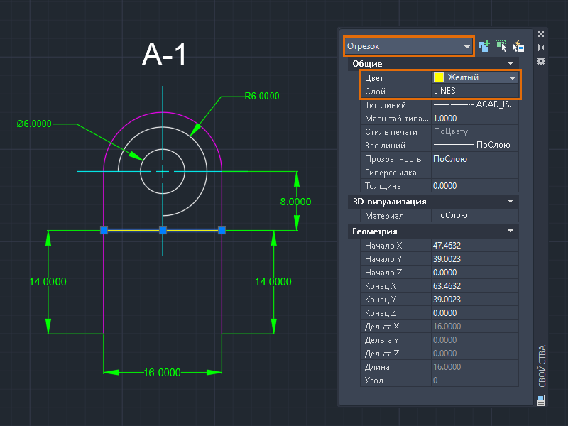 4. Любое свойство, назначенное слою, можно переопределить. Предположим, вы хотите изменить цвет объекта, но оставить его на том же слое ЛИНИИ. Выполните следующие действия.