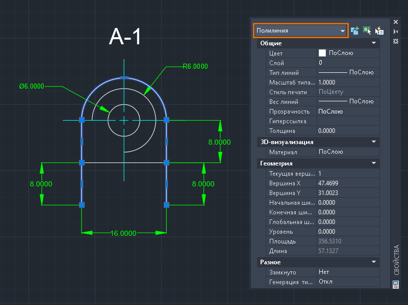 Обратите внимание на то, что для полилинии и маркера центра доступны разные свойства.