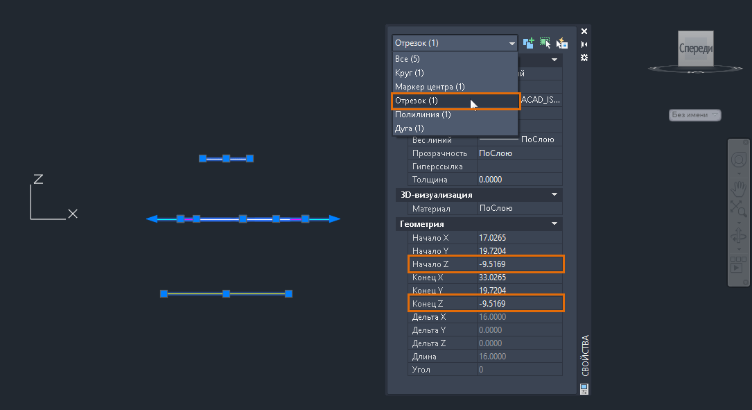 Разные объекты будут иметь разные имена свойств оси Z. Объект может иметь одно или несколько следующих свойств: «Начало Z», «Конец Z», «Положение Z» (многострочный текст), «Центр Z» (окружности) или «Уровень» (полилинии).