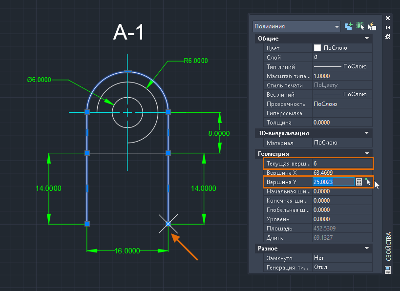 9. Для корректировки первой вершины на палитре свойств в разделе «Геометрия» щелкните поле «Текущая вершина».