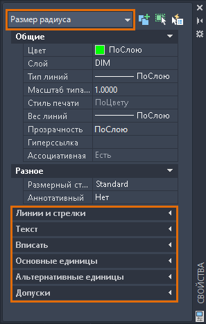 Свойства и параметры, отображаемые на палитре, меняются в зависимости от выбранных объектов или контекста чертежа; при вставке блока или видового экрана на лист. Например, при выборе размера отображаются дополнительные свойства, относящиеся к типу размерного объекта.