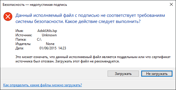 При загрузке файла пользовательской программы с цифровой подписью AutoCAD LT или программа на основе AutoCAD проверяет цифровую подпись, добавленную к файлу. Отображается сообщение о проверке цифровой подписи, которое позволяет пользователю загружать или не загружать файл программы в среду чертежа.