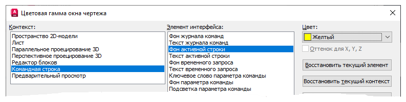 В диалоговом окне «Цветовая гамма окна чертежа» в разделе «Контекст» выберите «Командная строка».