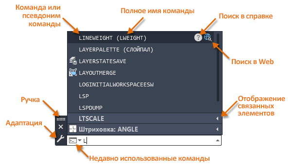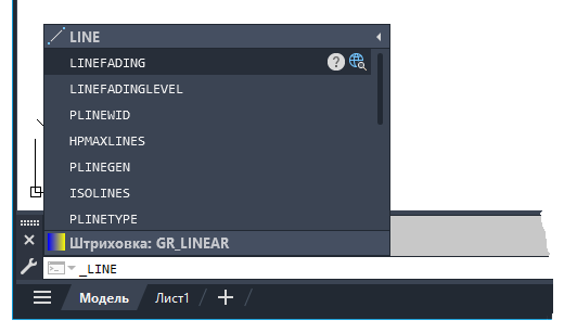 Если начать вводить слово (в данном примере буква Л), отображается список доступных команд и системных переменных. Эта функция называется автозавершением. Затем можно выбрать нужную команду или системную переменную.