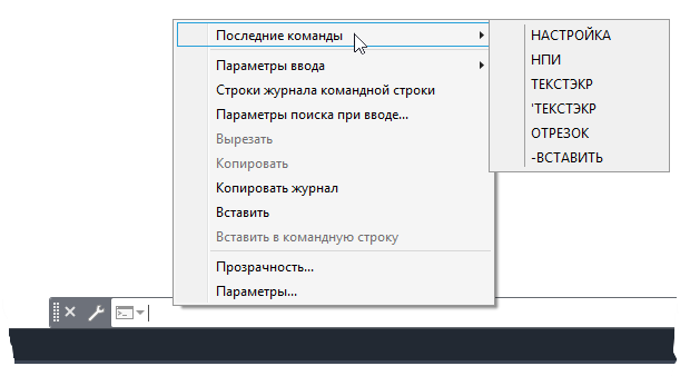 Кроме того, можно щелкнуть правой кнопкой мыши в окне команд и выбрать нужную команду в меню «Последние команды».