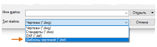 При работе в одиночку можно создавать файлы шаблонов чертежей в соответствии с собственными рабочими требованиями, и со временем, приобретя больше опыта, менять настройки для реализации тех или иных функциональных замыслов. Чтобы изменить существующий файл шаблона чертежа, нажмите кнопку «Открыть», в диалоговом окне выбора файла укажите тип файла «Шаблоны чертежей (*.dwt)» и выберите соответствующий файл.