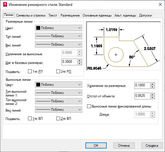 С помощью размерных стилей можно задать и обеспечить соблюдение стандартов черчения. Доступно множество размерных переменных, которые можно задать с помощью команды РЗМСТИЛЬ, позволяющей управлять практически всеми нюансами отображения и поведения размеров. Все эти параметры хранятся в каждом из размерных стилей.
