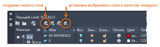 Как показано на рисунке, слой 10 «СТЕНЫ» является текущим. Все новые объекты автоматически размещаются на этом слое. В списке слоев зеленая отметка рядом со слоем 10 "СТЕНЫ" подтверждает использование этого слоя в качестве текущего.