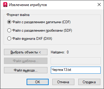 Указывает имя и положение файла, в который будут записаны извлеченные данные атрибутов. Введите путь и имя файла для извлеченных данных атрибута либо выберите "Файл вывода", чтобы выполнить поиск уже существующих файлов шаблонов в стандартном окне выбора файлов. Расширение имени файла .txt добавляется к файлам CDF или SDF, а расширение .dxx добавляется к файлам DXF.