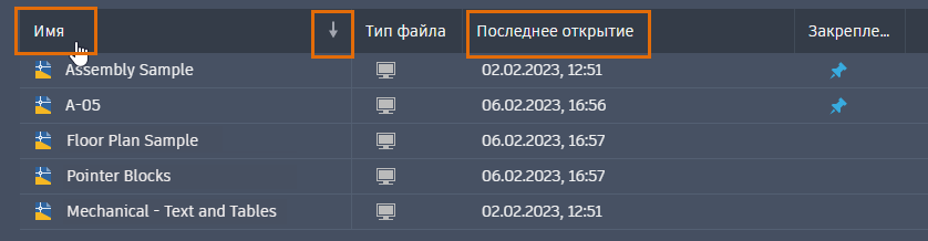 - Вид списка: щелкните заголовок столбца «Имя» или «Последнее открытие», чтобы отсортировать документы. Щелкните вертикальную стрелку справа от метода сортировки, чтобы инвертировать порядок сортировки.