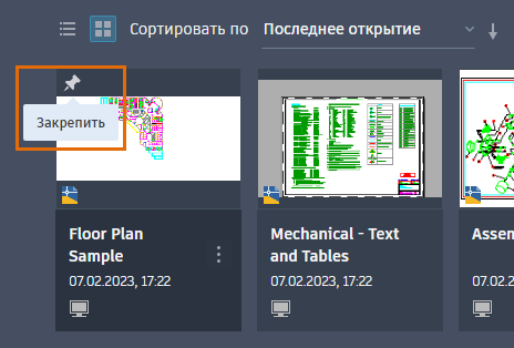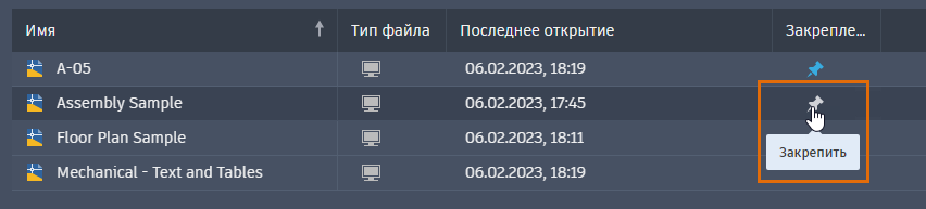 Прим.: Закрепленные документы всегда отображаются в верхней части списка.