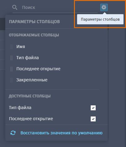При просмотре в виде списка значок параметров столбцов (зубчатое колесо) в верхнем правом углу можно использовать для настройки вида путем переключения отображаемых столбцов и порядка их отображения. Столбцы «Имя» и «Закреплено» всегда отображаются как первый и последний столбцы соответственно.