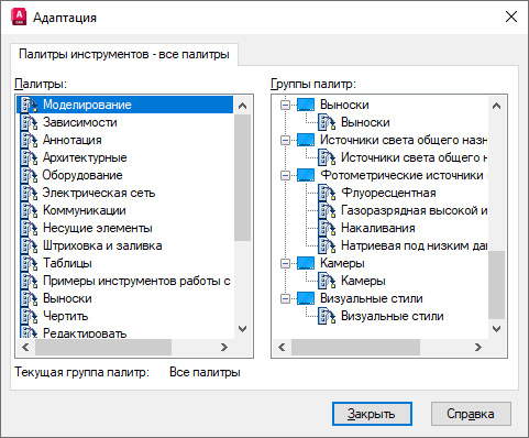 • Удалить. Удаление группы инструментальных палитр из программы и профиля текущего пользователя.