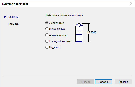 Мастер быстрой подготовки состоит из двух страниц: "Единицы" и "Область рисования". Для перемещения по страницам Мастера используются кнопки "Назад" и "Далее"; кнопка "Готово" завершает работу Мастера и создает новый чертеж с указанными параметрами.