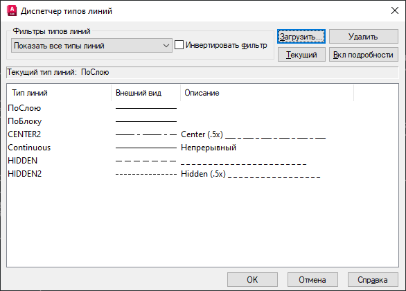 Удаляет выбранные типы линий из чертежа. Можно удалить только неиспользуемые типы линий. Типы линий ПОСЛОЮ, ПОБЛОКУ и CONTINUOUS нельзя удалить.