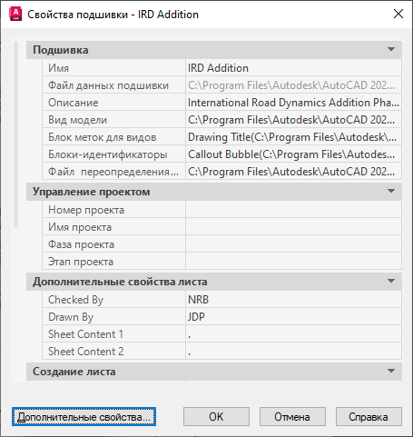 К такой информации относятся путь и имя файла данных подшивки (DST), пути к папкам, содержащим файлы чертежей, относящихся к подшивке, и другие пользовательские свойства подшивки