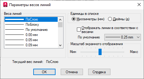 Задание текущего значения и единиц измерения веса линий, управление отображением и масштабом отображения веса линий, а также выбор значения веса линий ПО УМОЛЧАНИЮ для слоев.