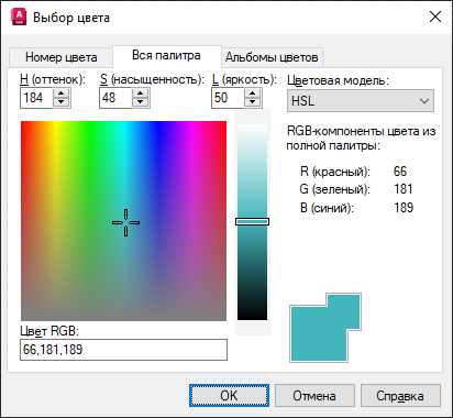 Задание цвета из полной палитры цветов (True Color, 24-битные цвета). Цвет выбирается с помощью цветовой модели HSL (оттенок, насыщенность, яркость) или RGB (красный, зеленый, синий). Полная палитра содержит более 16 миллионов цветов. В зависимости от выбранной цветовой модели на вкладке "Вся палитра" доступны различные параметры.