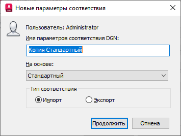 Вызов диалогового окна "Изменить параметр соответствия DGN". В зависимости от выбранного типа соответствия (импорт или экспорт) отображается диалоговое окно импорта или экспорта.
