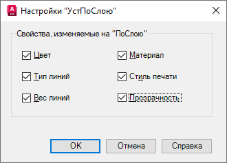 Изменяет материал выбранных объектов на ПоСлою (SETBYLAYERMODE=8)