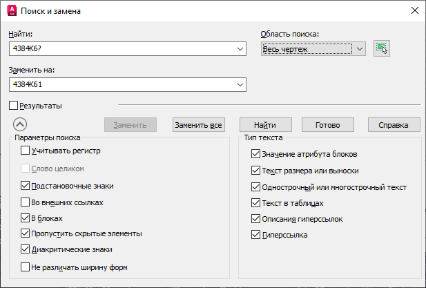 Например, если в чертеже есть несколько похожих фрагментов и все их необходимо заменить на 4384K61, введите 4384K6? в поле «Найти» и 4384K61 в поле «Заменить на».