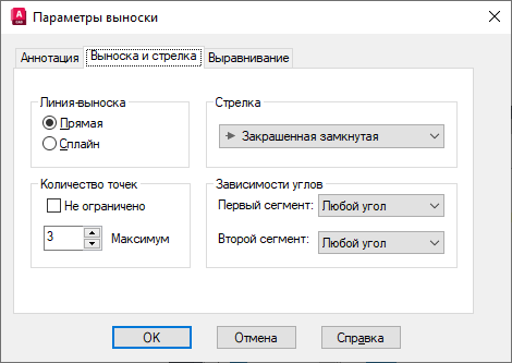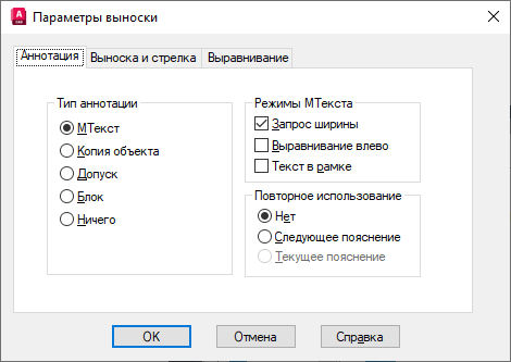 Диалоговое окно "Параметры выноски" состоит из следующих вкладок: "Аннотация", "Линия выноски и стрелка", "Выравнивание".