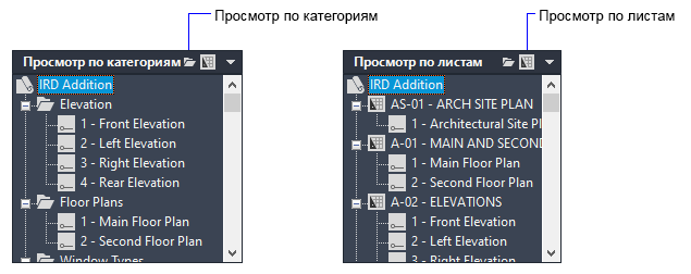 - Категории видов часто определяются функционально. Например, в архитектуре уместна категория видов с названием "Уровни"; а в машиностроении - категория видов с названием "Расчлененные". Виды можно отображать по категориям или по листам, на которых они расположены. При необходимости категории могут быть вложены в другие категории. Для перемещения вида в другую категорию его можно перетащить в области структуры или использовать команду контекстном меню "Установить категорию".