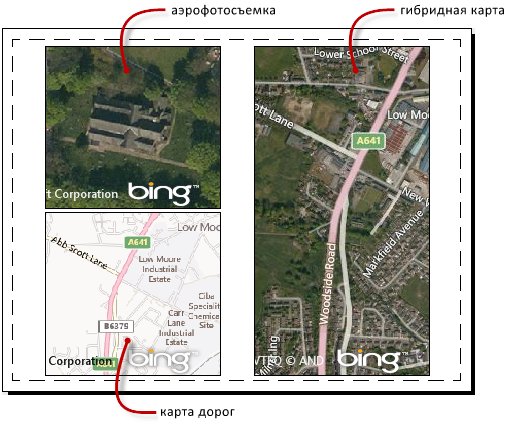 Можно отобразить карту в виде космического снимка (аэронавигационная карта) или векторного изображения (дорожная карта). Также отобразить карту можно в виде сочетания аэронавигационной и дорожной карт. Если область чертежа делится на несколько видовых экранов, каждый из них может иметь свой стиль карты.