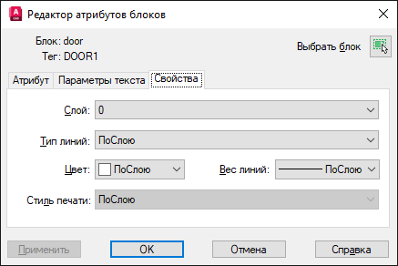 Здесь задается слой, на котором находится атрибут, вес и тип линий, а также цвет текста атрибута. Если чертеж использует именованные стили печати, с помощью данной вкладки можно связать атрибут со стилем печати.