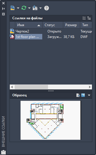 Можно просматривать относящуюся к файлам информацию о подложках, вставленных в чертеж, в палитре "Внешние ссылки". Также имеется возможность загружать и выгружать подложки и производить иные операции.