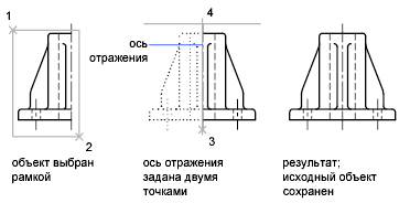 Зеркальное отображение объектов производится относительно оси отражения. Ось отражения задается двумя точками. Можно выбрать удаление или сохранение исходных объектов.