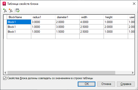 Таблица свойств блока позволяет задавать значения параметров и свойства в определении блока, а также управлять ими.