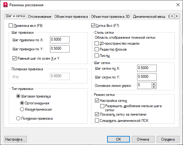 Включает и отключает режим "Шаг". Режим шаговой привязки также можно включать и отключать с помощью кнопки "Режим привязки" в строке состояния, клавиши F9 или системной переменной SNAPMODE.