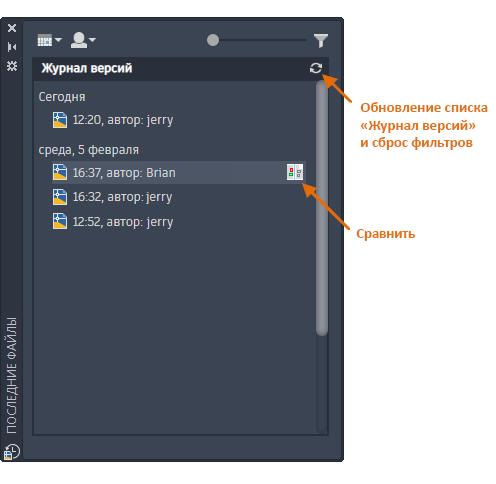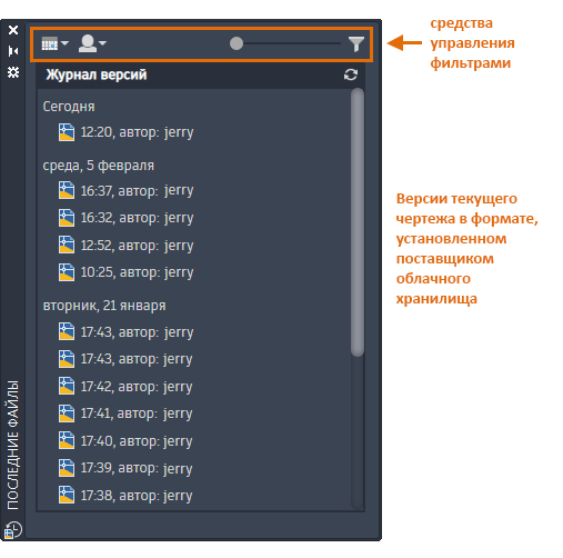 На палитре «Последние файлы» отображаются версии чертежей, сохраненных в OneDrive, Dropbox и Box. При каждом сохранении чертежа в учетной записи посредством облачного хранилища происходит создание и сохранение предыдущей версии чертежа на случай, если потребуется его сравнение с текущей версией. Эти предыдущие версии формируют журнал версий чертежа.