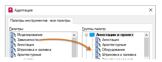 - Вставка инструментов из одной палитры в другую.
