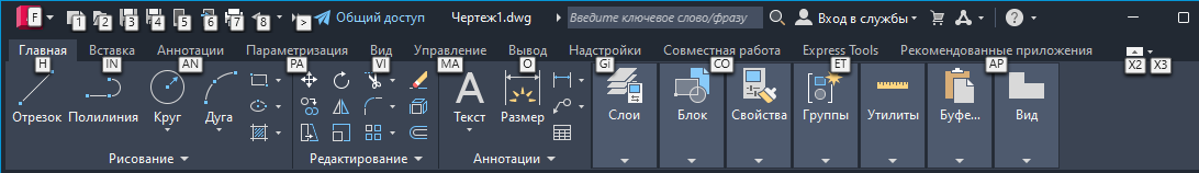 Чтобы сделать выбор в меню, на панели быстрого доступа и ленте, вместо устройства указания можно использовать сочетания клавиш. Чтобы определить, какие сочетания клавиш доступны в текущем рабочем пространстве, нажмите клавишу Alt.