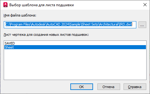 На экран выводится список и указывается имя листа в файле шаблона чертежа, который будет использоваться при создании новых листов.