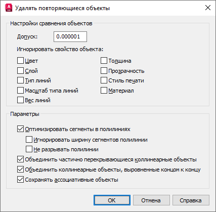 Эти параметры служат для управления тем, как команда OVERKILL обрабатывает линии, дуги и полилинии.