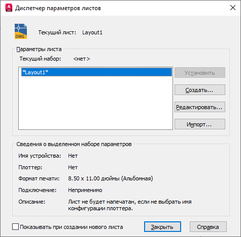 Отображает текущий набор параметров листа; позволяет изменить текущий набор, создать новый набор, изменить параметры существующих наборов и импортировать параметры листа из других чертежей.