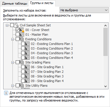 Отображение параметров, управляющих набором листов, представленных в текущей таблице со списком листов.