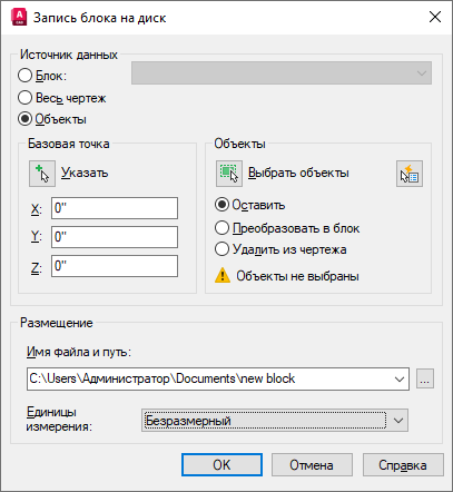 Запись выбранных объектов или преобразование блока в указанный файл чертежа.
