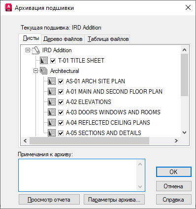Список листов, включаемых в пакет архива, в том порядке, в котором они были созданы, и в соответствии со структурой группы. Подшивка должна быть открыта в "Диспетчере подшивок". Архивация может быть инициирована либо из контекстного меню, если правой кнопкой мыши щелкнуть элемент подшивки верхнего уровня, либо путем ввода в командной строке команды АРХИВАЦИЯ.