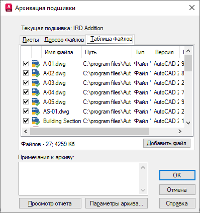 Список файлов, включаемых в упаковку архива, в виде таблицы. По умолчанию сюда заносятся все файлы, на которые ссылается текущий чертеж (такие как внешние ссылки, стили печати и шрифты). Пользователь может добавить файлы в упаковку архива или удалить существующие файлы из него. В архив не включаются файлы, ссылки на которые установлены посредством URL.