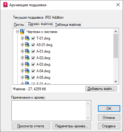 Отображение списка файлов, включаемых в пакет архива, в виде иерархического дерева. По умолчанию в этом списке перечислены все файлы, связанные с текущим чертежом (внешние ссылки, стили печати и шрифты). Пользователь может добавить файлы в упаковку архива или удалить существующие файлы из него. В архив не включаются файлы, ссылки на которые установлены посредством URL.