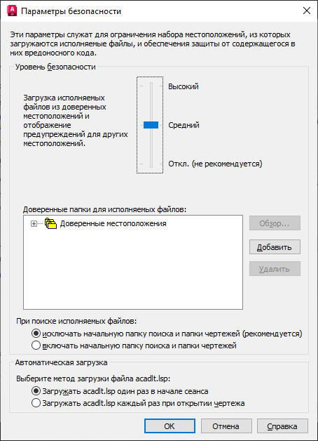 Определение уровня ограничения пути для исполняемых файлов, а также отображение диалогового окна с предупреждением. (системная переменная SECURELOAD)
