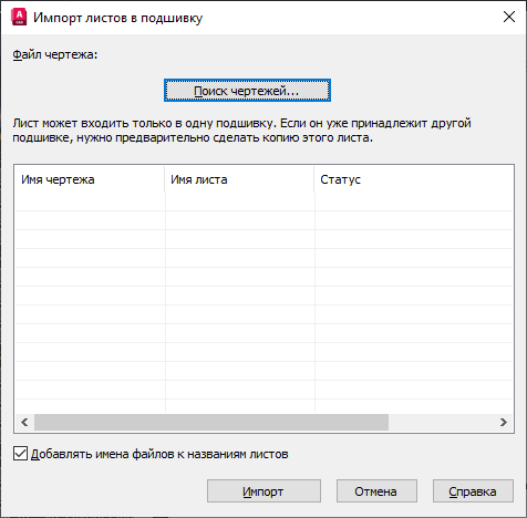 Позволяет осуществлять быстрый импорт листов чертежей в подшивку.