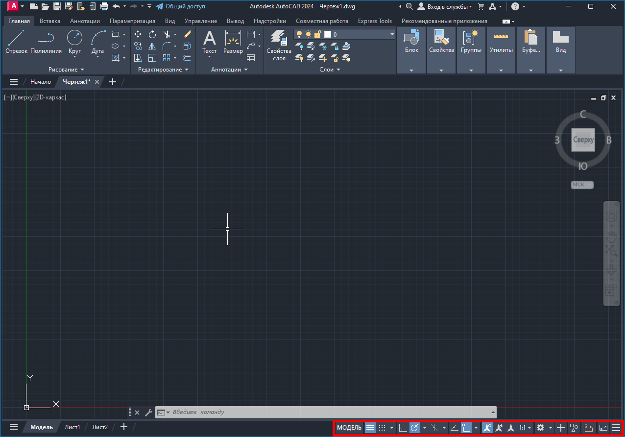 В строке состояния отображается положение курсора, инструменты чертежа, а также инструменты, которые влияют на среду чертежа.
