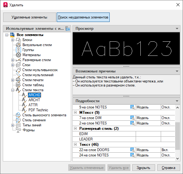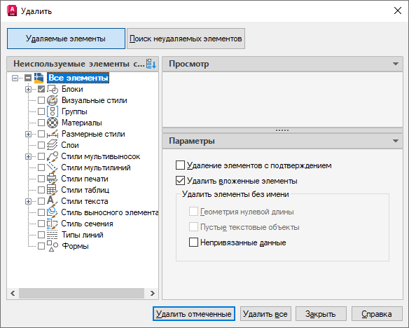 Чаще всего такие объекты либо используются в чертеже, либо являются стандартными элементами, удаление которых запрещено. Когда выбираются отдельные именованные объекты, выводится информация о том, почему нельзя удалить выбранный элемент.