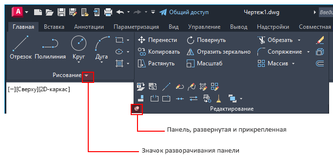 панель можно будет развернуть для отображения дополнительных инструментов и элементов управления. По умолчанию выплывающие панели автоматически закрываются при щелчке в области другой панели. Чтобы оставить панель развернутой, щелкните значок булавки (