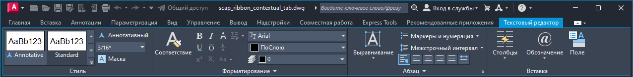 При выборе объекта определенного типа или выполнении некоторых команд отображается контекстная вкладка ленты вместо панели инструментов или диалогового окна. Она закрывается по завершении работы с командой.